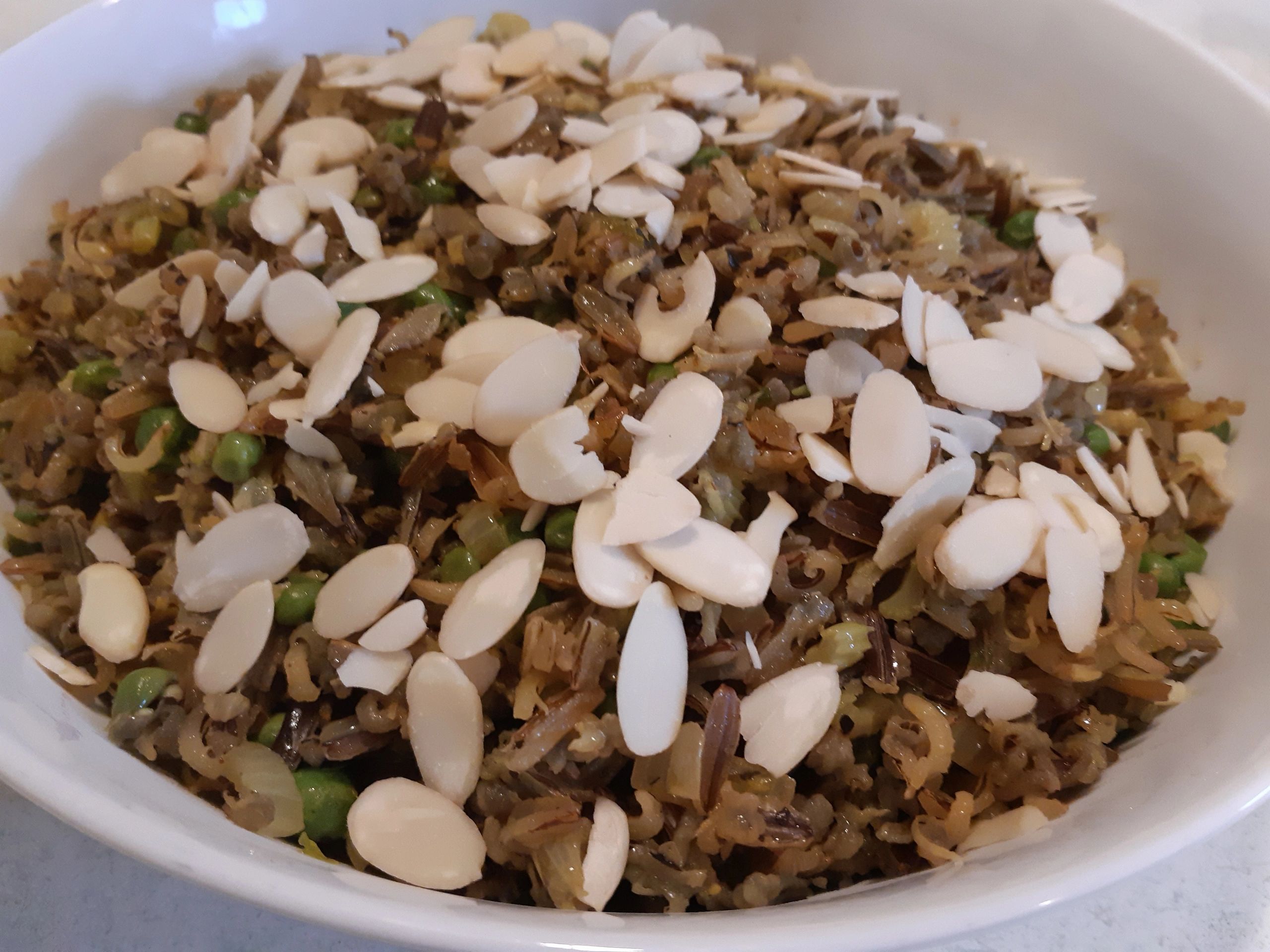 Once it is combined, you can serve in a bowl and garnish with slivered almonds on top.